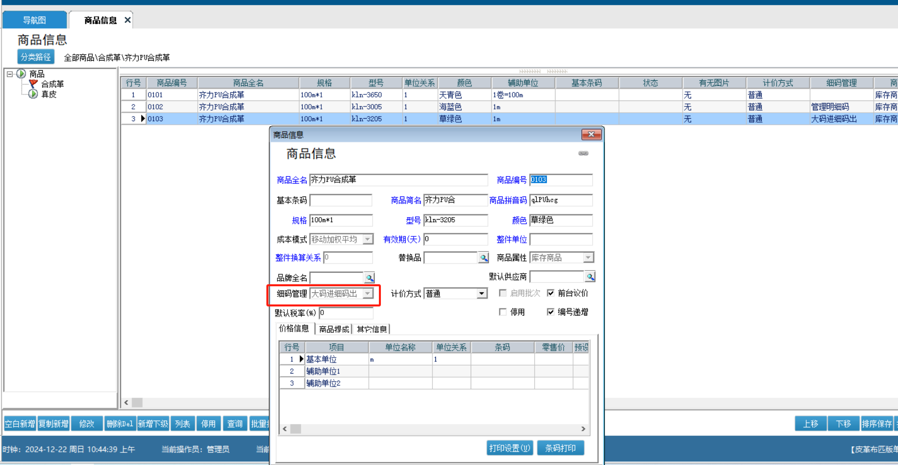 管理明细码:针对所有的产品都进行明细码管理进出入库,也可手动更改明细长度来进行是否减零操作;