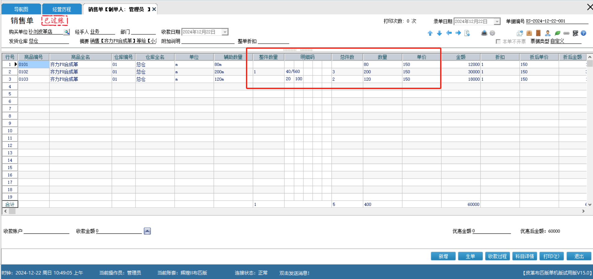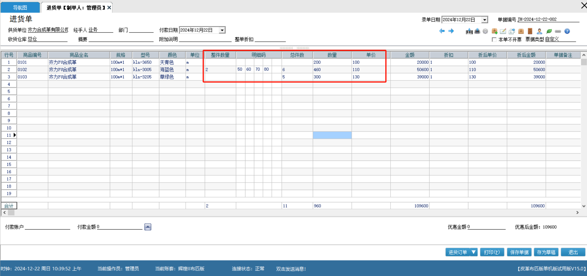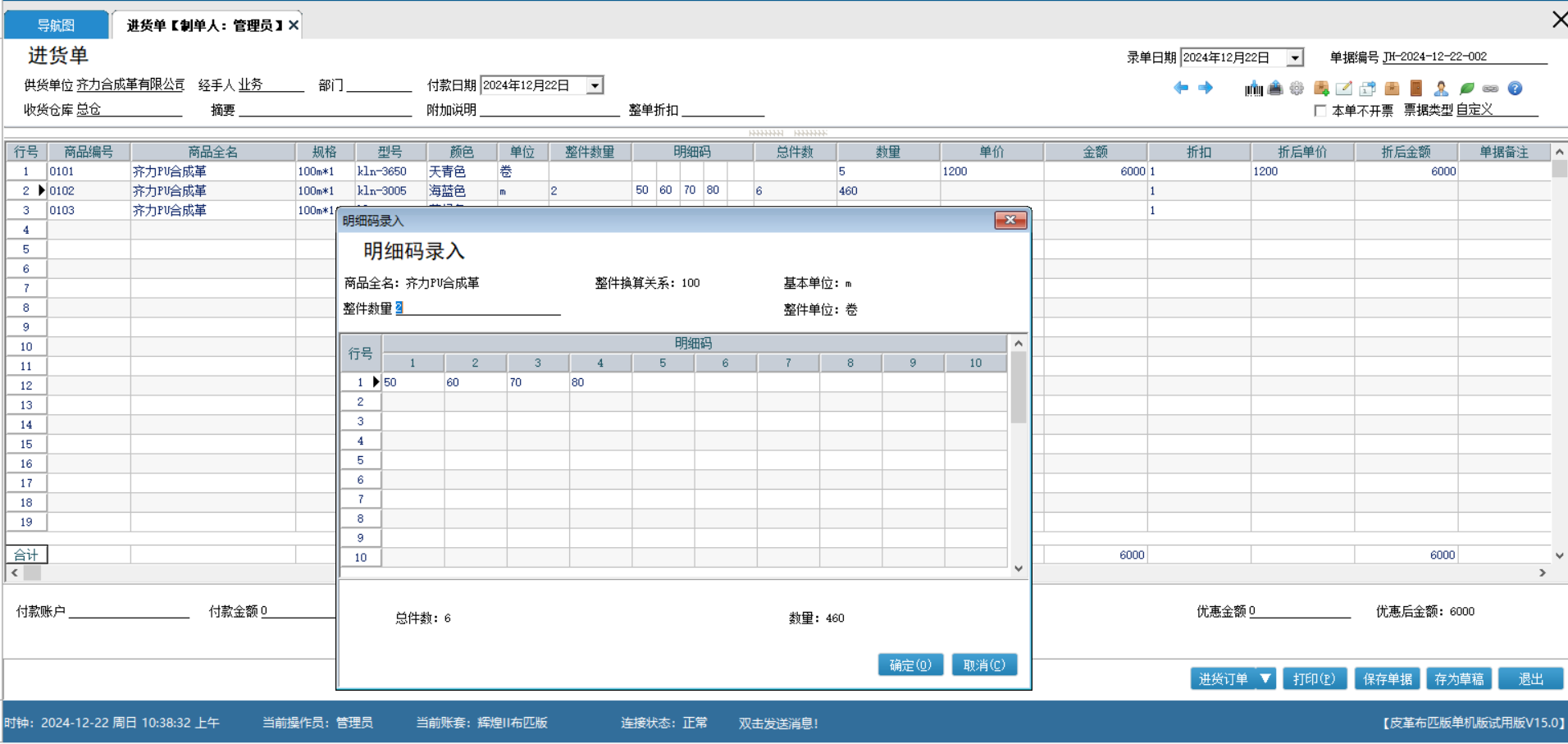 进货选择商品时可以根据不同的明细码来进行更符合行业标准的进货明细录入,完成后系统会自动进行数量金额的计算,大大节约人工计算的时间成本;